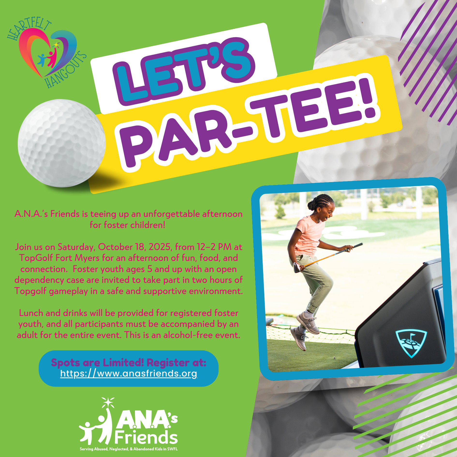 Thanks to the generous support of Topgolf, the A.N.A.βs Friends Board of Directors, and private donors, we are excited to invite foster youth to an afternoon of fun, fellowship, and golf!