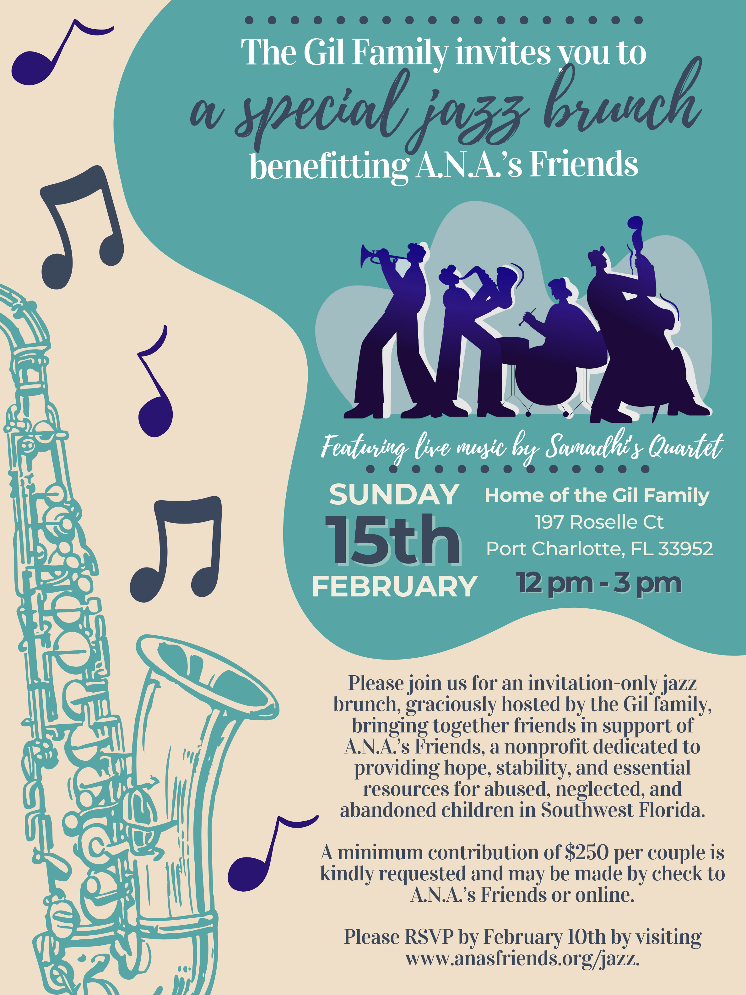 Please join us for an invitation-only jazz brunch, graciously hosted by the Gil family, bringing together friends in support of A.N.A.’s Friends, a nonprofit dedicated to providing hope, stability, and essential resources for abused, neglected, and abandoned children in Southwest Florida. The afternoon will be set to the soulful, sophisticated sounds of live jazz by Samadhi’s Quartet, creating an intimate and elevated atmosphere for meaningful connection, community, and impact.